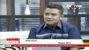 Lihatkepri.com, Bintan – Bupati Bintan Apri Sujadi bersama Deputi Bidang Pengembangan dan Pemasaran Pariwisata Nusantara Esthy Reko Astuti menjadi narasumber pada program Talkshow Coffee Break TV One di Studio Epicentrum Walk Kuningan Jakarta, Rabu pagi (13/12). Acara Talkshow yang dipandu oleh Addri Danu dan Rosalin itu mengusung tema wisata Cross Border Bintan.