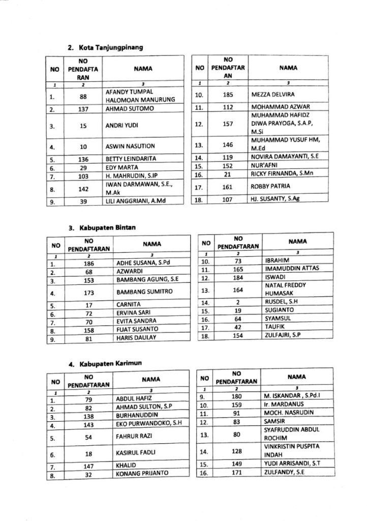 Lihatkepri.com, Tanjungpinang – Berdasarkan Peraturan KPU RI Nomor 7 Tahun 2018 dan Hasil Rapat Pleno Tim Seleksi Calon Anggota Komisi Pemilihan Umum Kabupaten/Kota Provinsi Kepulauan Riau Periode 2018-2023 pada Hari Senin, 26 Maret 2018 pukul 15.00 WIB s/d selesai, dengan ini diumumkan nama-nama peserta seleksi Calon Anggota KPU Kabupaten/Kota Provinsi Kepulauan Riau Periode 2018-2023 yang dinyatakan Lulus Tes Tertulis dengan Metode Computer Assisted Test (Berdasarkan Abjad) sebagai berikut :