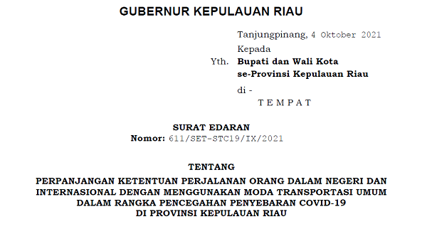 Lihatkepri.com, Tanjungpinang – Surat Edaran Gubernur Kepulauan Riau Nomor 611/SET-STC19/X/2021 tentang Perpanjangan Ketentuan Perjalanan Orang Dalam Negeri dan Internasional dengan Menggunakan Moda Transportasi Umum dalam rangka Pencegahan Penyebaran COVID-19 di Provinsi Kepulauan Riau