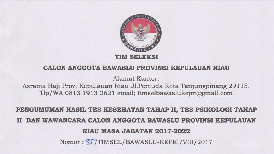 Hasil Tes Tertulis, Tes Kesehatan Tahap I dan Tes Psikologi Tahap I Calon Bawaslu KEPRI 2017-2022
